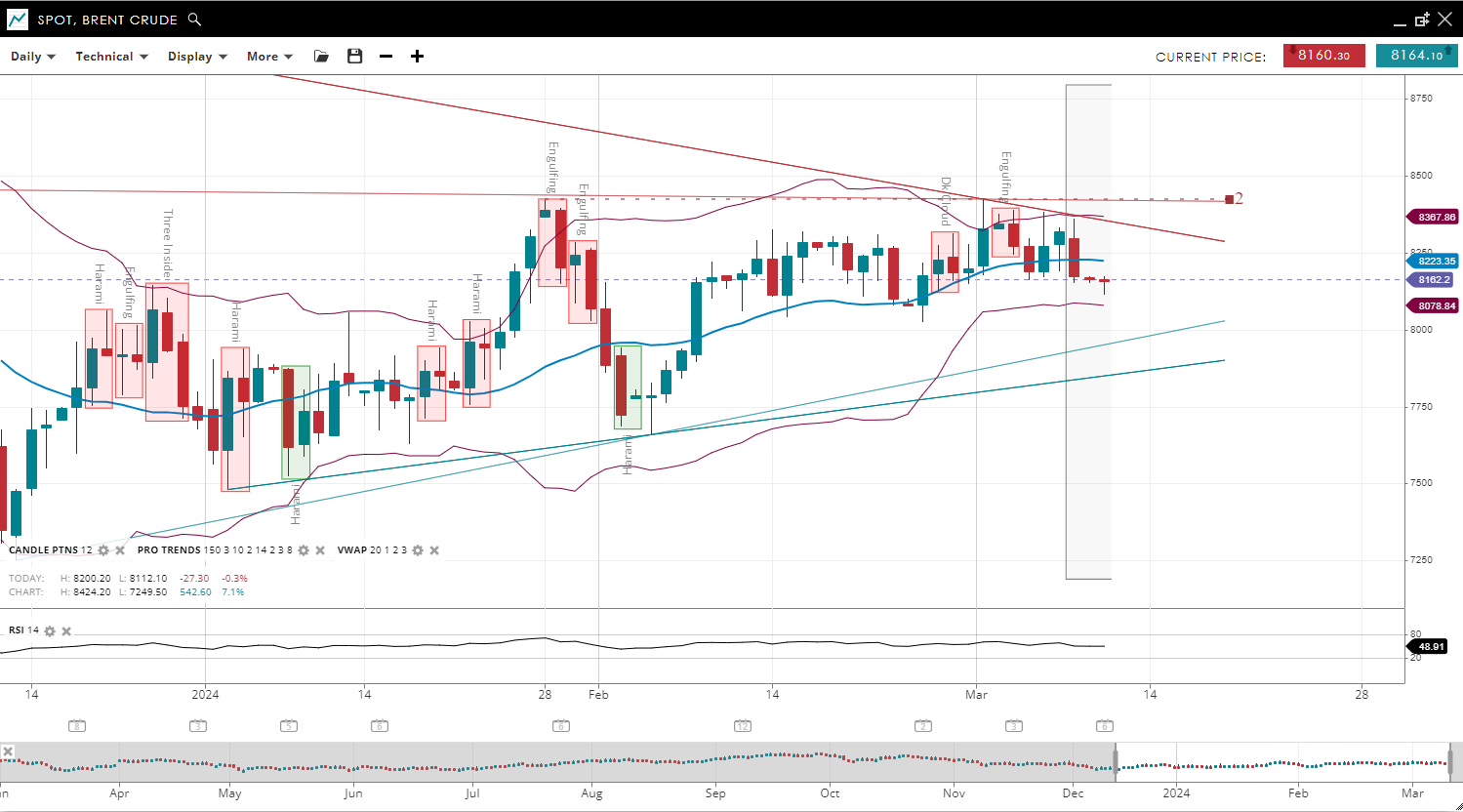 Brent Crude is consolidating in a neutral trend with a slight bullish bias, with its price decreasing to 81.62, below the 20-period VWAP of 82.23. The support level has adjusted to 80.78, with resistance remaining very close at 83.67. The RSI is at 48, indicating a shift to neutral momentum.