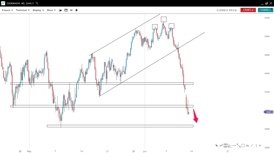 The price of GER40 successfully broke the bullish channel to the downside after posting an inverse head and shoulders formation. The market now is under a key support level which could be a new resistance level to any bounce. If this resistance holds, the price might reach the 13,280 mark.