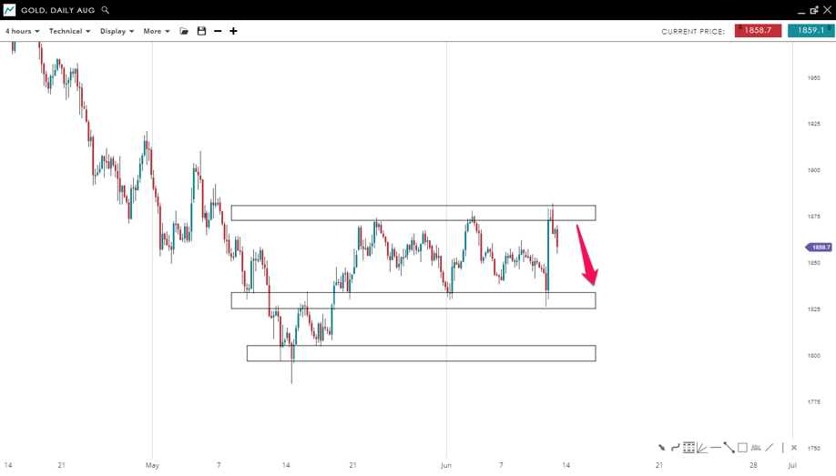 Gold is bouncing within the range made of a key support level and a key resistance level with the respective price values at 1,830 & 1,875. The price found sellers near the higher end of this channel where it could be about to reverse as indicated by the bearish engulfing pattern near resistance. If the sellers continue to be in charge of the market, it could see a move lower to the lower end of the range which is near 1,830.