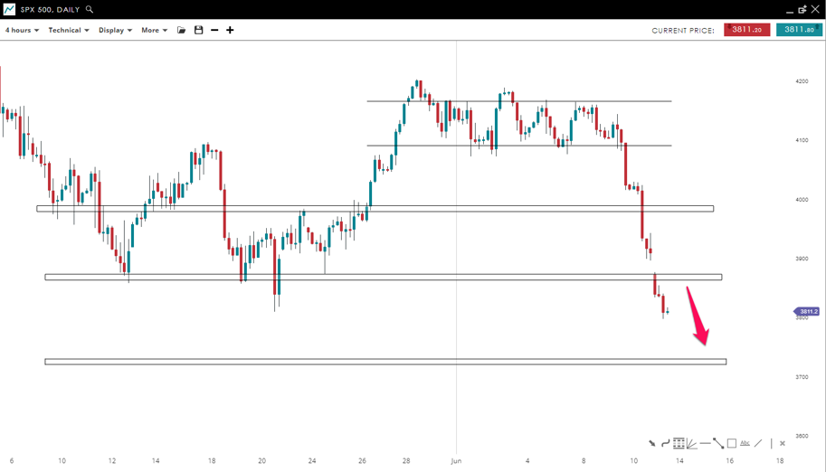After breaking the parallel channel to the downside, the price of SPX500 is under huge selling pressure, allowing for the break of the support level around 3,865. The downtrend is healthy since slight and brief corrections are posted along with huge bearish impulsive waves. Further movement to the downside is expected toward the 3,725 level.