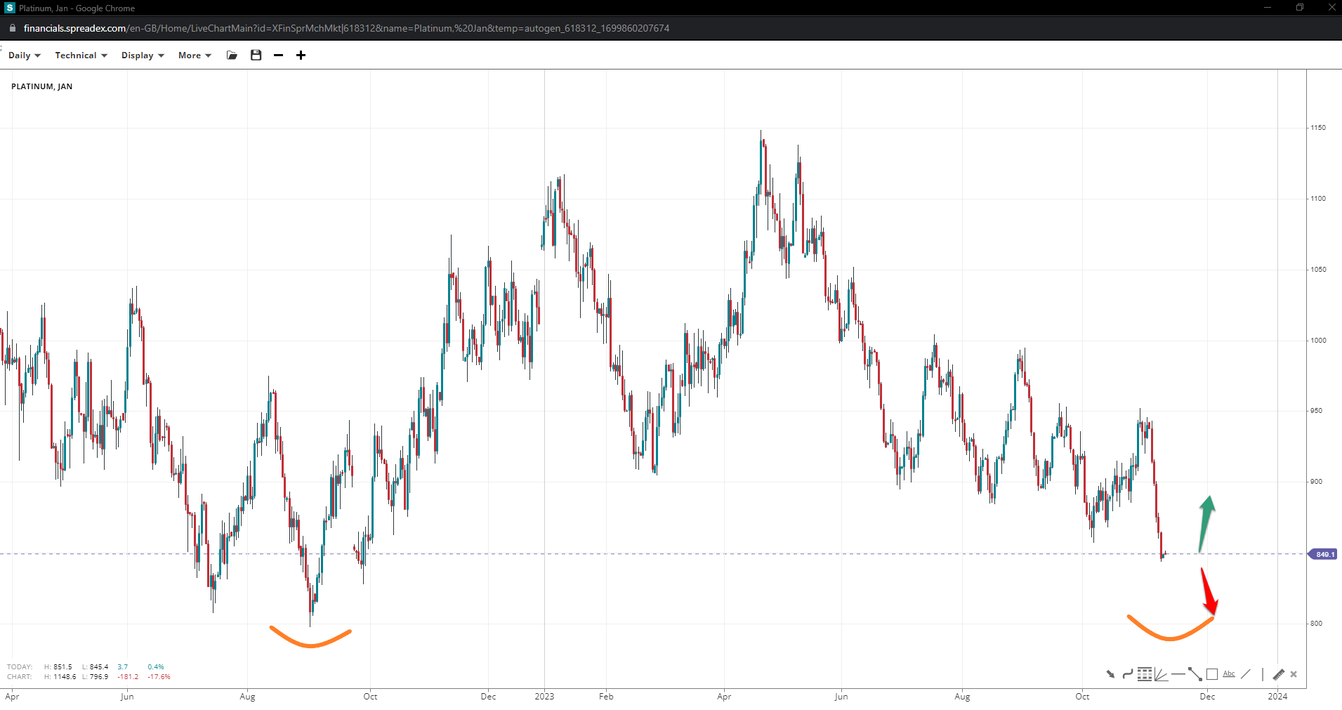 Platinum is heading towards the 800 handle where it’s expected to bounce amidst a double-bottom formation. Additional drops could open the door to the next round support seen at 750. Reversing earlier is unlikely to bear any fruits towards 1K unless bulls recapture 950.