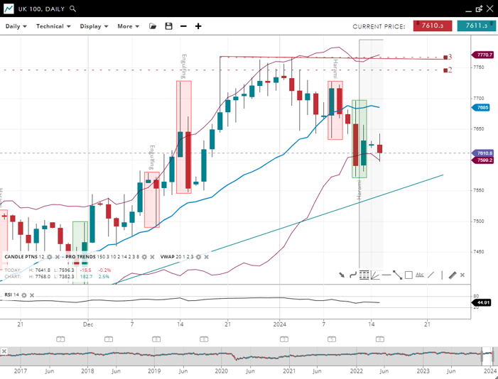 | UK 100 | Neutral | 7685 | 7599.2 | 7770.9 | 44 |
