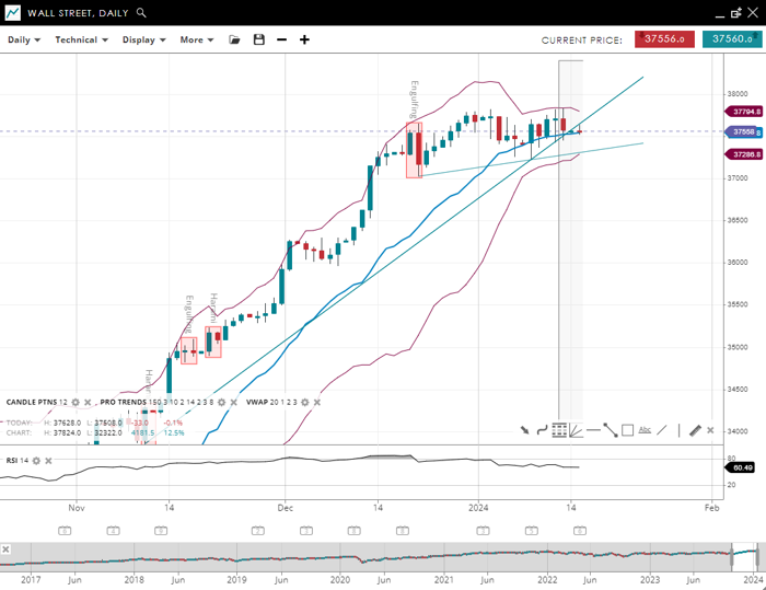 Wall Street is currently in a bullish trend with the price consistently above the 20-period VWAP of 37,540. It has support at 37,286 and resistance at 37,795. The RSI is at 60, indicating moderate bullish momentum that has come down from overbought conditions.