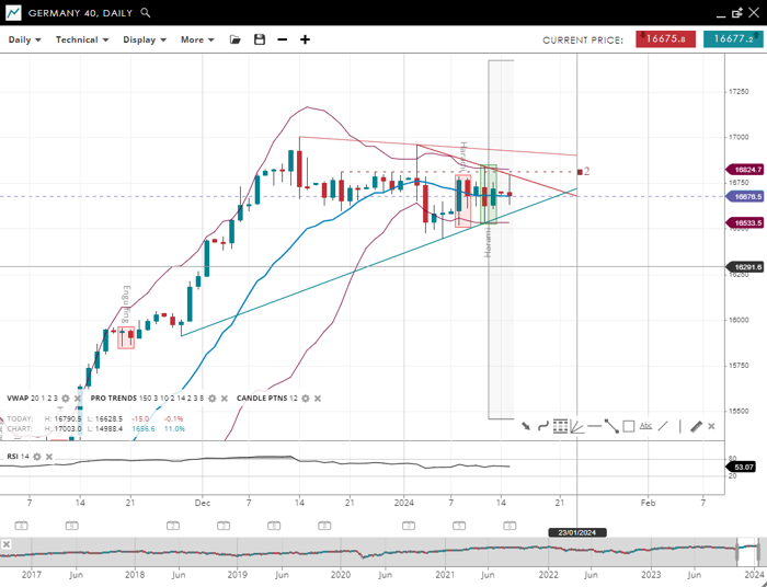 Germany 40 is now exhibiting a neutral trend. The price is oscillating around the 20-period VWAP of 16,676. The index finds support at 16,533 and resistance at 16,824. The RSI has risen to 53, indicating a market that is neither overbought nor oversold, allowing for potential movement in either direction.