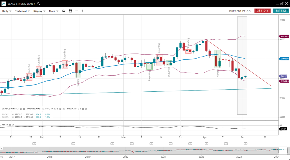 Wall Street has taken a bearish turn and is in an impulsive phase. The price has dropped to 38,112, falling below the VWAP of 39,005. Support and resistance levels have been adjusted to 37,854 and 40,158, respectively. The RSI has decreased to 35, signalling a shift to bearish momentum.
