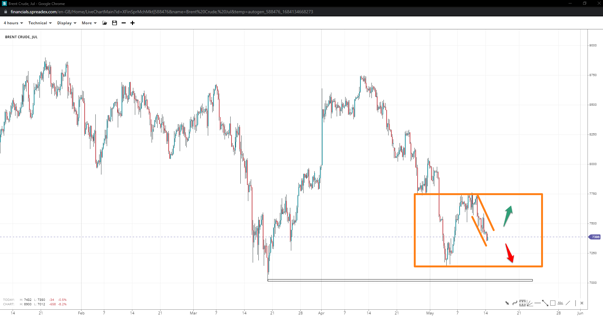Brent oil formed a double top at $77.50/bbl and slid to a potential flag correction unless the low at $71.50/bbl gives way to $70/bbl. If bulls fail to reclaim the top for a chance at $80/bbl, we might experience a consolidation.