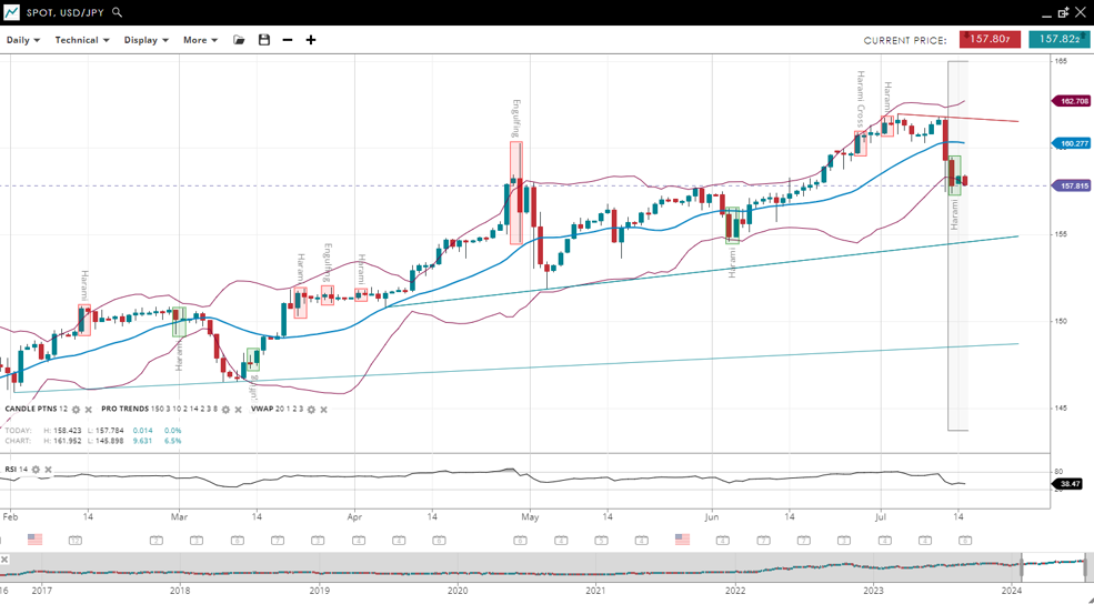 USD/JPY remains in a bullish trend and near multi-decade highs and remains within a corrective phase just above the VWAP, with the price near 157.81. Support has adjusted higher to 157.80, while resistance has increased to 162.70. The RSI has decreased to 38, reflecting a reduction in bullish momentum compared to the previous report.