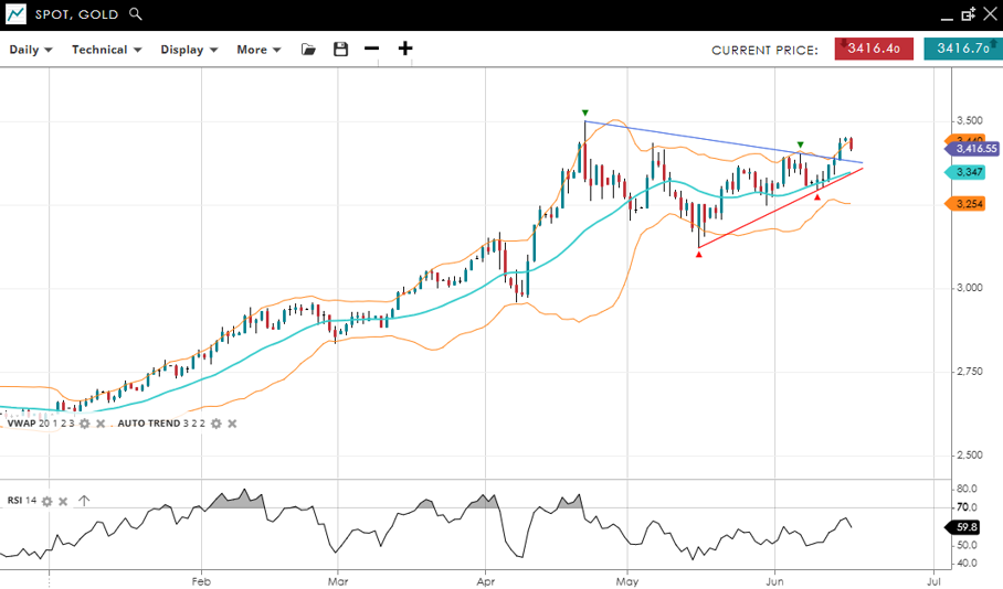 Gold has entered a possible bullish breakout, moving above the prior sideways range. Trading at 3,416, it is comfortably above the VWAP of 3,347. RSI at 59.8 points to positive momentum. Support is seen at 3,254, with resistance at 3,440.