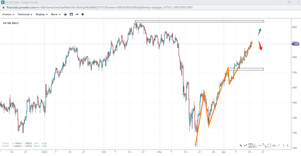 The FTSE 100 index has surged above 7850, but prices have extended a lot to be at risk of a potential selloff down to 7800. If the impulse is completed, it might attract additional bearish bets towards 7720. On the other hand, if the index breaks past 7915, we might get that leg to 8045.
