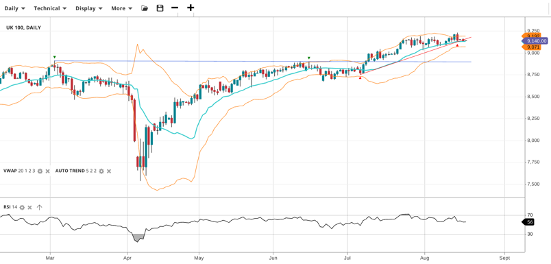 UK 100 remains bullish but consolidating, trading at 9,140, slightly above VWAP 9,129. RSI at 56 reflects steady upward bias. Support is 9,071, resistance is 9,192.