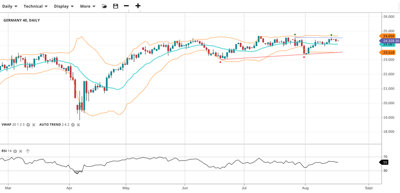 Germany 40 is range-bound at 24,328, near its VWAP of 24,087. RSI at 55 indicates stable momentum. Support is 23,518 while resistance is 24,656.