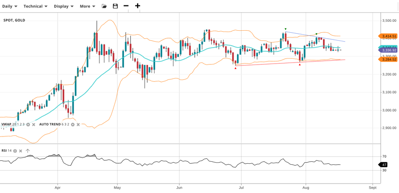 Gold remains sideways and in the middle of its large range at 3,337, near VWAP 3,340. RSI at 47 reflects neutral tone. Support is 3,285, resistance 3,415.
