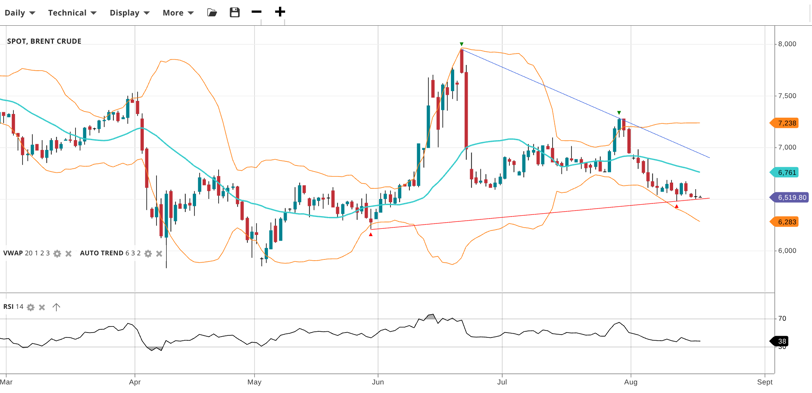 Brent Crude is still in a choppy range, down to 6,520, now well below VWAP 6,761. RSI at 38 signals bearish momentum. Support stands at 6,283, resistance at 7,238.