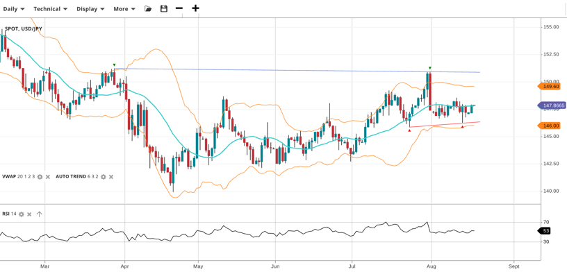 USD/JPY stays range-bound at 147.87, aligned with VWAP 147.9. RSI at 53 reflects a neutral outlook. Support is 146.00, resistance 149.60.