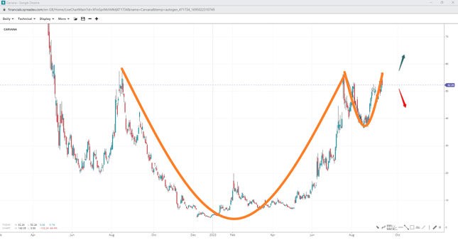 Carvana’s stock price resembles a cup-and-handle pattern, with the triple top at $57 potentially clearing the path to the handle’s measured-move projection of $78. If bears lose the bottom of $36, the long-term formation may end up being an inverse head-and-shoulders, provided $20 holds firm.