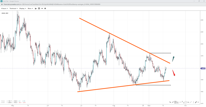Gold’s bounce at the lower triangle trendline appears to improve the chances of the pattern’s completion unless bulls lose $1920/oz or $1910/oz. Crawling past the last correction high of $1980/oz could offer an attempt at 2k.