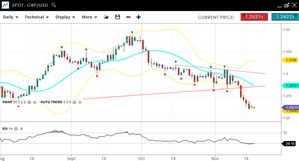 GBP/USD is neutral in a consolidation phase, trading at 1.2622, below the VWAP (20) of 1.28701. Support sits at 1.25384, and resistance is at 1.3156. With an RSI of 29.10, the pair shows increasing bearish momentum within its consolidation range, now approaching oversold territory.