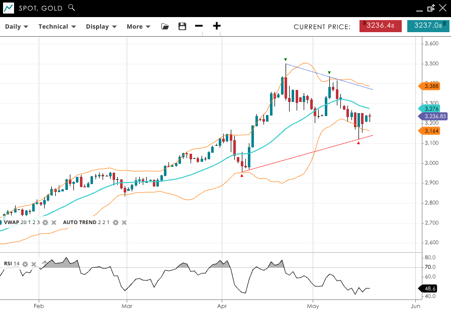 Gold has for now ended its bullish trend and entered a consolidation phase, trading at 3,237, slightly below its now down-sloping VWAP of 3,276. RSI at 48.6 shows softening momentum. Support is at 3,164, and resistance is at 3,388.
