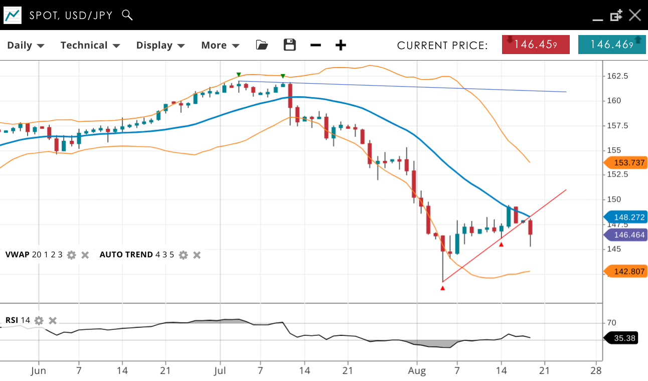 USD/JPY is in a major bearish trend and continues in an impulsive phase, with the price falling to 146.46, now below the VWAP of 148.27. Support is at 142.80, while resistance has adjusted to 153.73. The RSI has dropped to 35, indicating a continuation of strong bearish momentum.