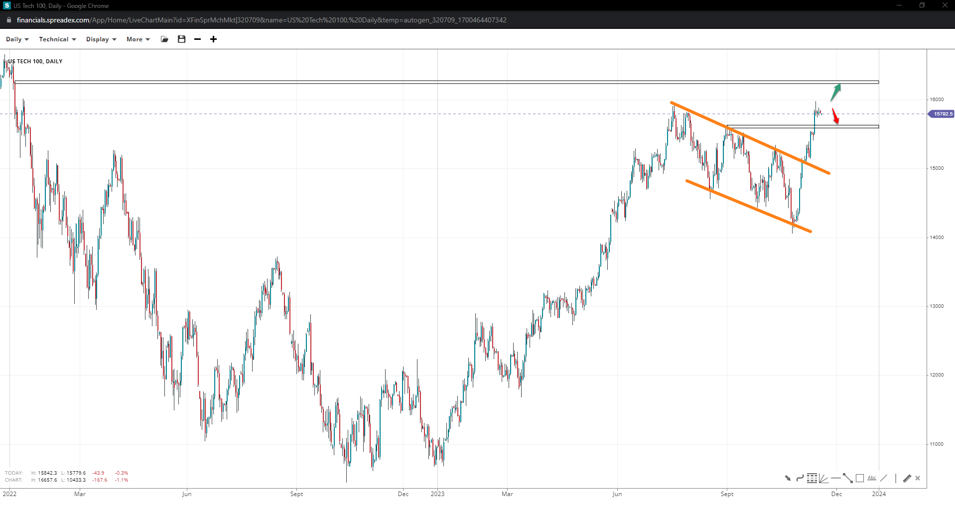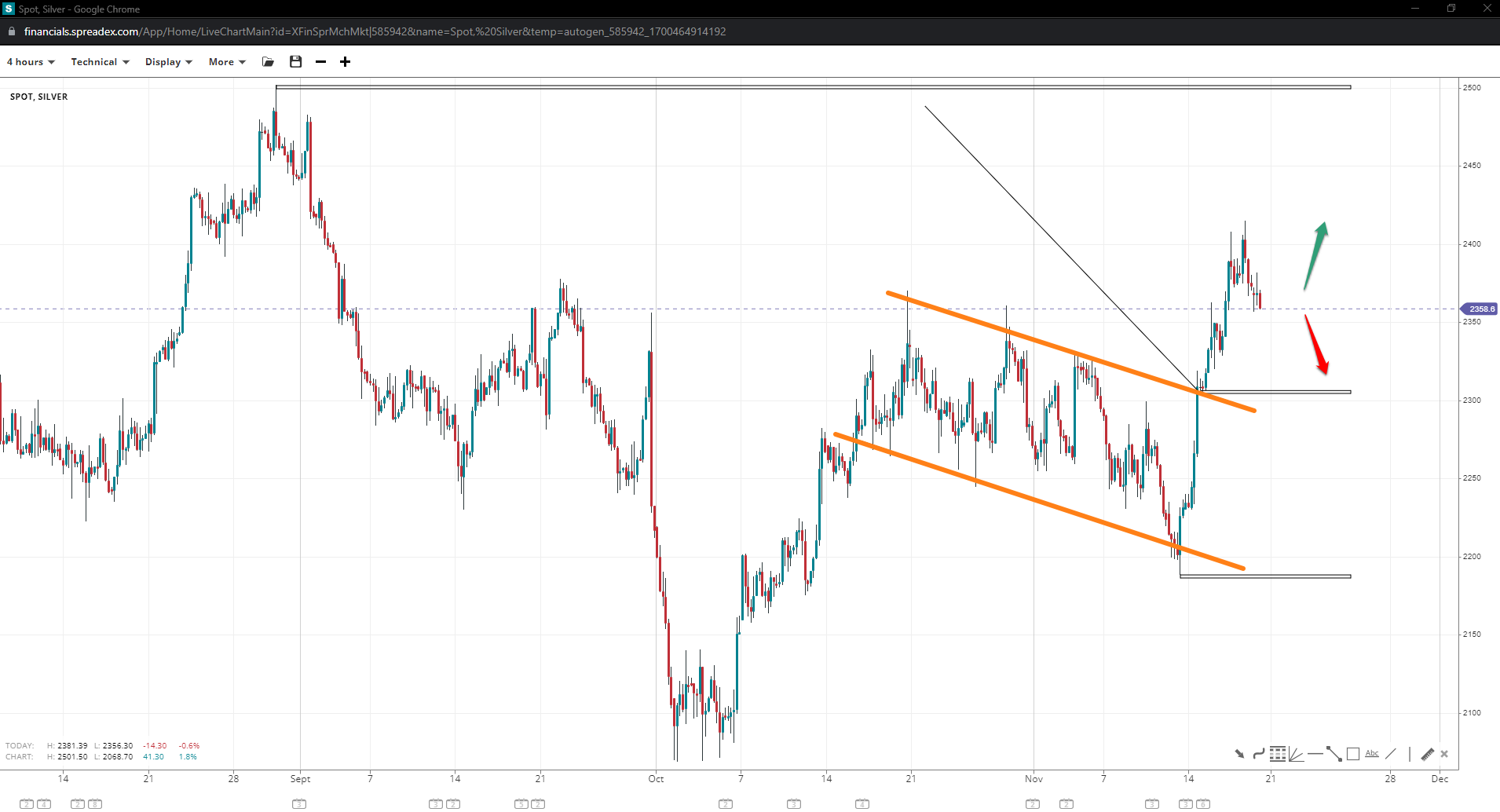 If bulls push for another high without losing the 7400 floor, the chances of a wedge will increase dramatically. 7600 or anywhere past the local peak, but under 7620 could instigate a pullback towards 7320 should it come in that order. The supports are expected to be at the same levels regardless.