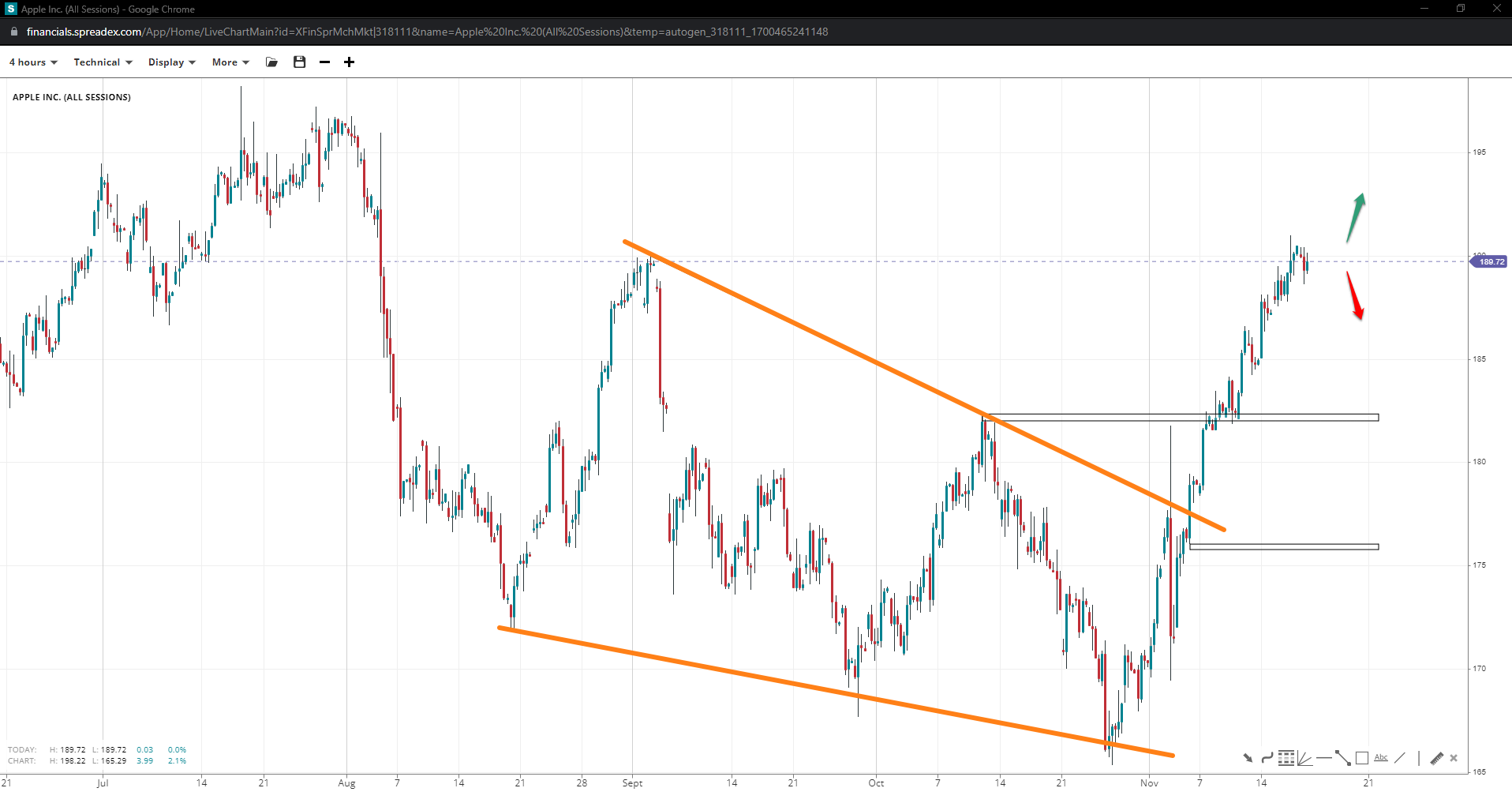 Apple received rejection at the first wedge peak near 190 but tested new territories, raising chances of an upward leap towards 200 and a pattern invalidation. If things turn south, prices could decline towards 175 if the 182 peak succumbs to pressure.