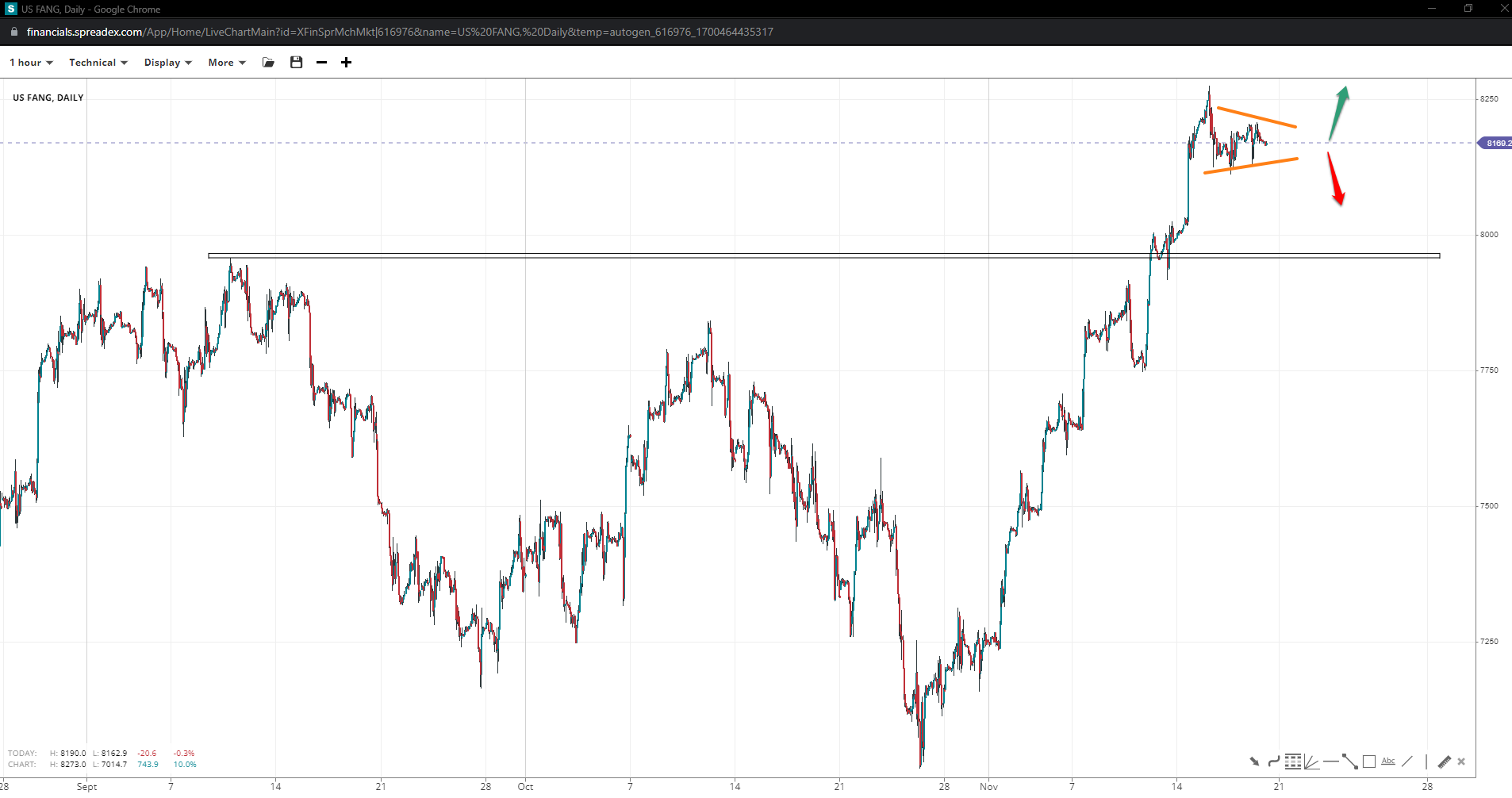 After failing to reclaim 8250, the FANG index is seen consolidating into a potential triangle pattern, with a slide under 8100 opening up the next swing spot above 7750 at 7960 and invalidating it. If bulls can take over, the next logical resistance is at 8500.