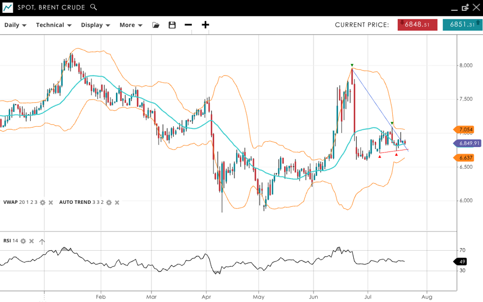 Brent Crude is in a neutral trend, currently in a tight range which fits inside a bigger range - with price at 6,849 and VWAP at 6,847. The RSI at 49 indicates balanced sentiment. Key support lies at 6,637, with resistance at 7,054.