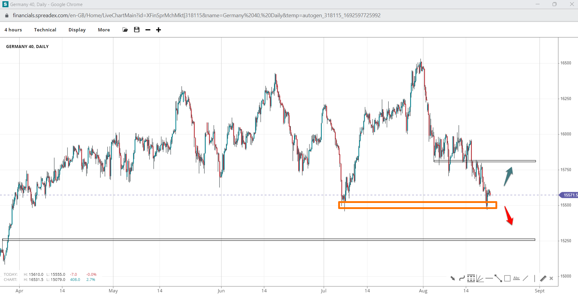 Germany's top 40 index has formed a double bottom at 15500, with a breakdown increasing the potential for a leg down to 15250 unless the formation holds firm. In such an event, bulls may push prices towards 15810.