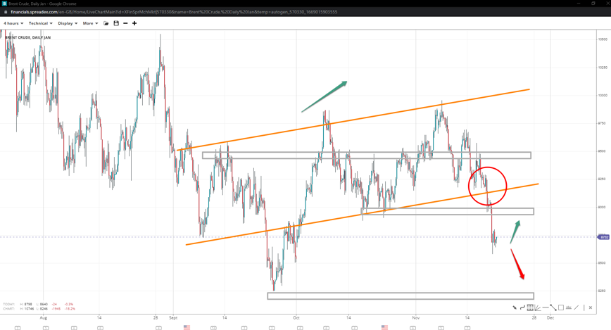 London gas prices seem to be finishing the completion of the 4th leg of a symmetrical triangle unless it slides to $910 for a descending variation or forms a pennant instead. If prices rise, the likelihood of moving closer to $1100 will increase, with the trendline being a potential rejection level and $1000 an interim resistance.