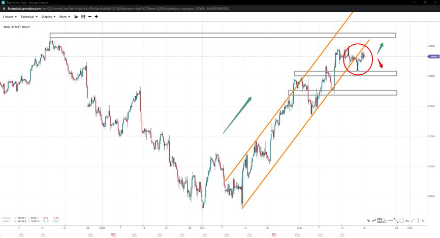 Wall Street failed to breach the 34k handle but remains in an upward trend, albeit not in the short term, as prices have exited the ascending channel. However, the pullback to 33150 offered a bounce to 33830, which brings the chances of consolidation up unless bulls attempt 34280. 33k remains a critical short-term support, the break of which exposes 32500.