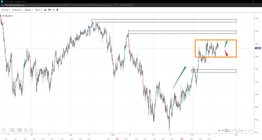 UK 100 failed to break the previous high at 7430 again, forming a double top but maintaining its bullishness above 7300, as it seems to be in a bullish flag pattern. Losing the range support brings 7240 on the radar with a firm base at 7200. On the other hand, an upwards breach opens the door to 7500 and the top of 7580.