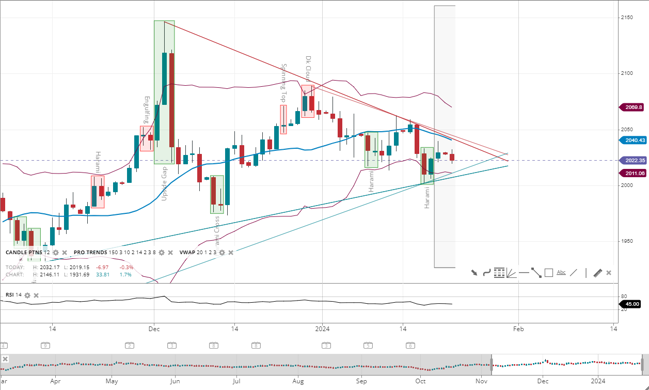 Gold has shifted to a bearish trend, with the current price 2 standard deviations from the 20-period VWAP of 2,040. It has support at 2,011 and resistance at 2,069. The RSI has decreased to 45, indicating bearish momentum.