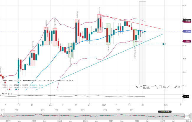GBP/USD shows a neutral trend, oscillating around the 20-period VWAP of 1.2706. The pair has bounced several times from support at around 1.2631 and resistance at 1.2786. The RSI is at 51, indicating a balanced market condition.