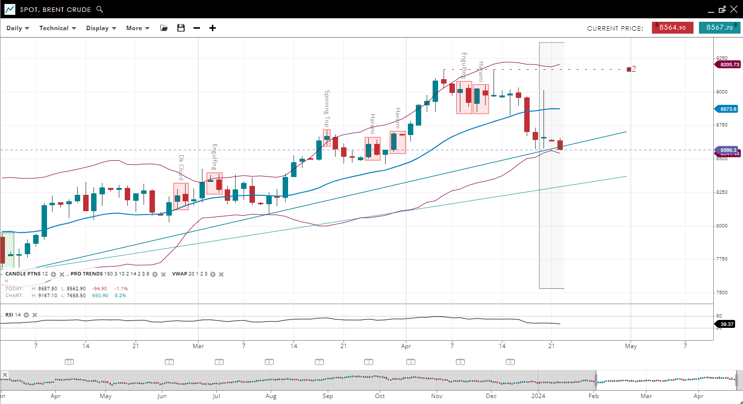 | Brent Crude | Bullish | Corrective | 85.66 | 88.73 | 85.41 | 92.05 | 39 |