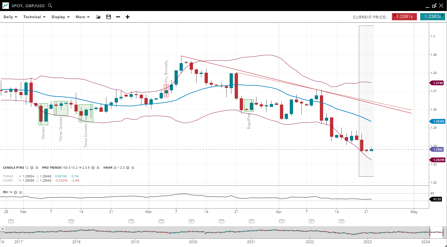 GBP/USD continues to be bearish and impulsive, with the price now at 1.2382, below the VWAP of 1.2535. The support level has been revised down to 1.2324, with resistance noted at 1.2746. The RSI has decreased to 31, indicating a slight intensification of bearish momentum.