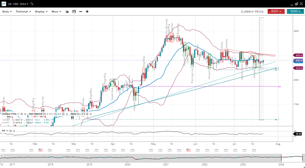 | UK 100 | Neutral | Consolidation | 8201 | 8200 | 8122 | 8253 | 49 |