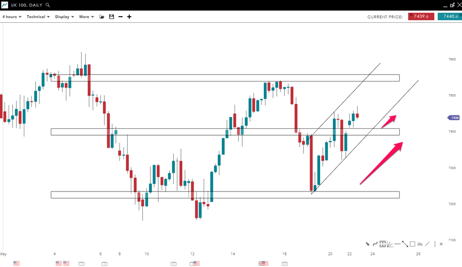 The index is currently trading inside a bullish channel formation. The price managed to break the resistance zone (previously support) around the 7,400 mark. The highest probability scenario is to see the price retracing to the new support before the buyers push it back toward the 7,550 mark.