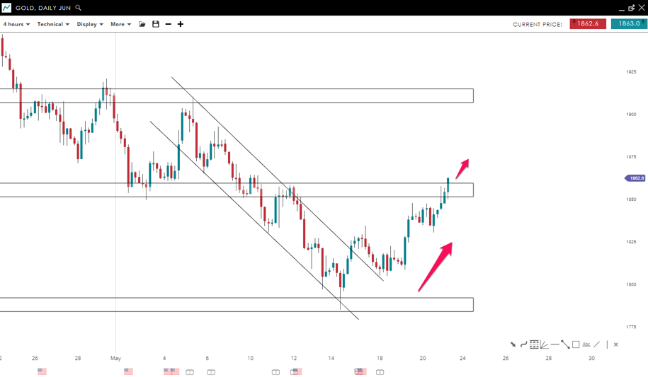 Gold successfully broke the bearish channel pattern to the upside by posting higher highs and lows. This indicates that the bulls are overwhelming the sellers. Currently, the price is trying to breach the 1,855 mark to the upside. If there is a close above this area, it could lead to a move higher all the way up toward the 1,910 mark.