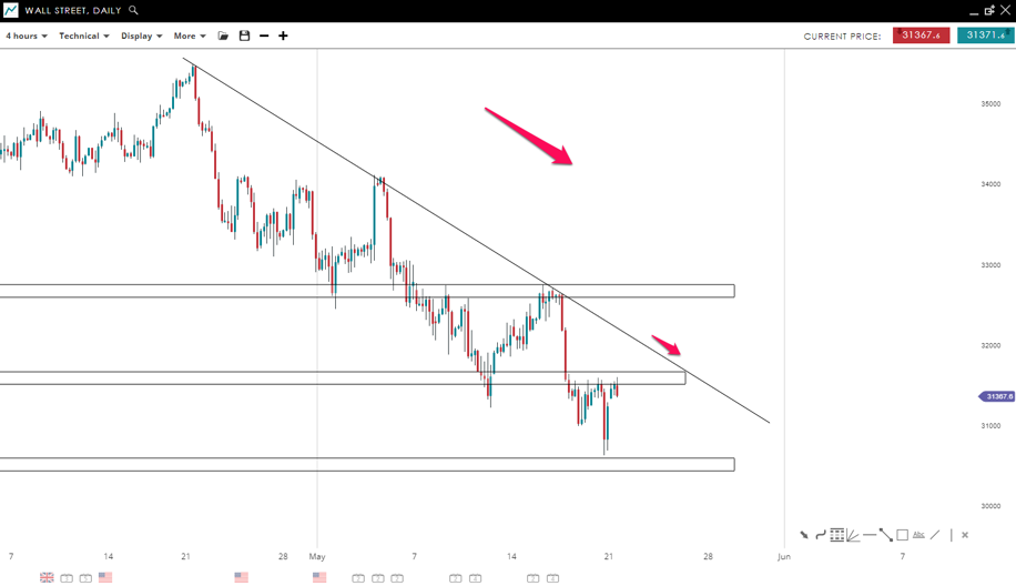 Wall Street is still in a downtrend, where the price is respecting a bearish trendline. The index posted a correction higher to the 31,600 mark, which could break if there is another leg up in the traditional ABC correction. Any breakout could meet new sellers willing to ride back the downtrend once the price reaches the trend line.