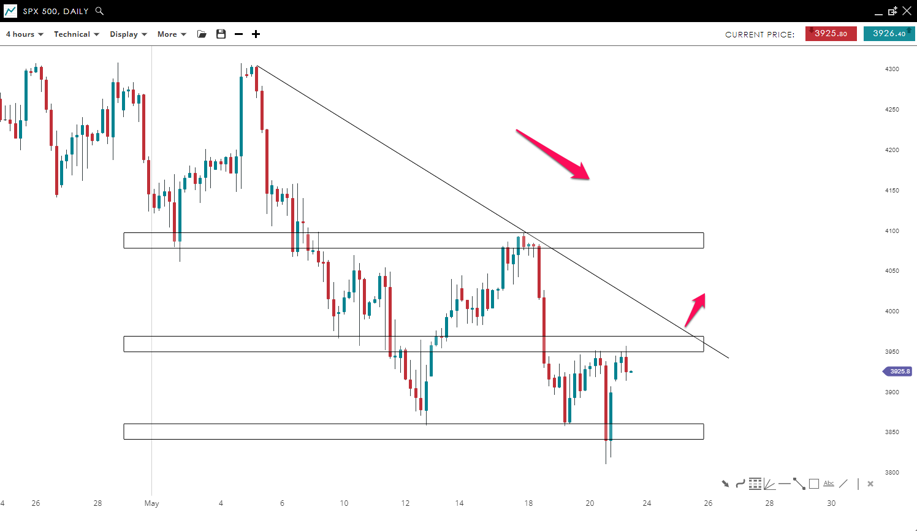 The index was in a downward movement before facing a strong support around the 3,850 mark, which happens to be right where the index enters a ‘bear market’ via a 20% decline from its record high. The price is in a consolidation phase which could lead to a reversal and a move higher if the bulls take control of the market. If this scenario occurs, we could see the price of SPX breaking the resistance zone (3,960) and the bearish trendline to the upside before reaching the 4,085 level.