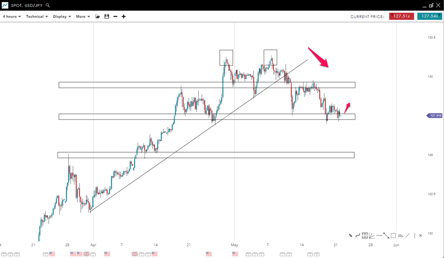 The price broke the bullish trendline to the downside after posting a double top formation. The market continued its move downward but faces a support zone near the 127 mark. We can see that the buyers are trying to push the price upward, which can be seen by the bullish bars near the support zone. If this occurs, the price of USD/JPY could return to the 129 level.