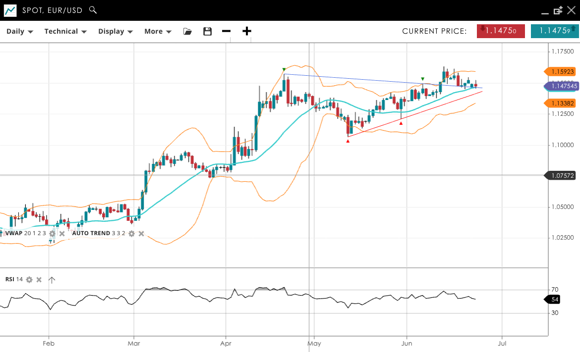 EUR/USD continues in a bullish correction phase, with the pair trading at 1.1475 - down from the recent 3yr high - and its VWAP close at 1.1450. RSI is steady at 54, suggesting moderate buying interest. Support is at 1.1338, and resistance is at 1.1592.