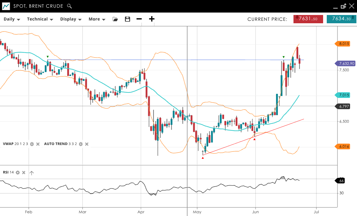 Brent Crude is in a very strong bullish impulsive phase, trading at 7,633 above its VWAP of 7,015. The RSI at 66 indicates strong upward momentum. Support is at 6,016, while resistance is found at 8,015.