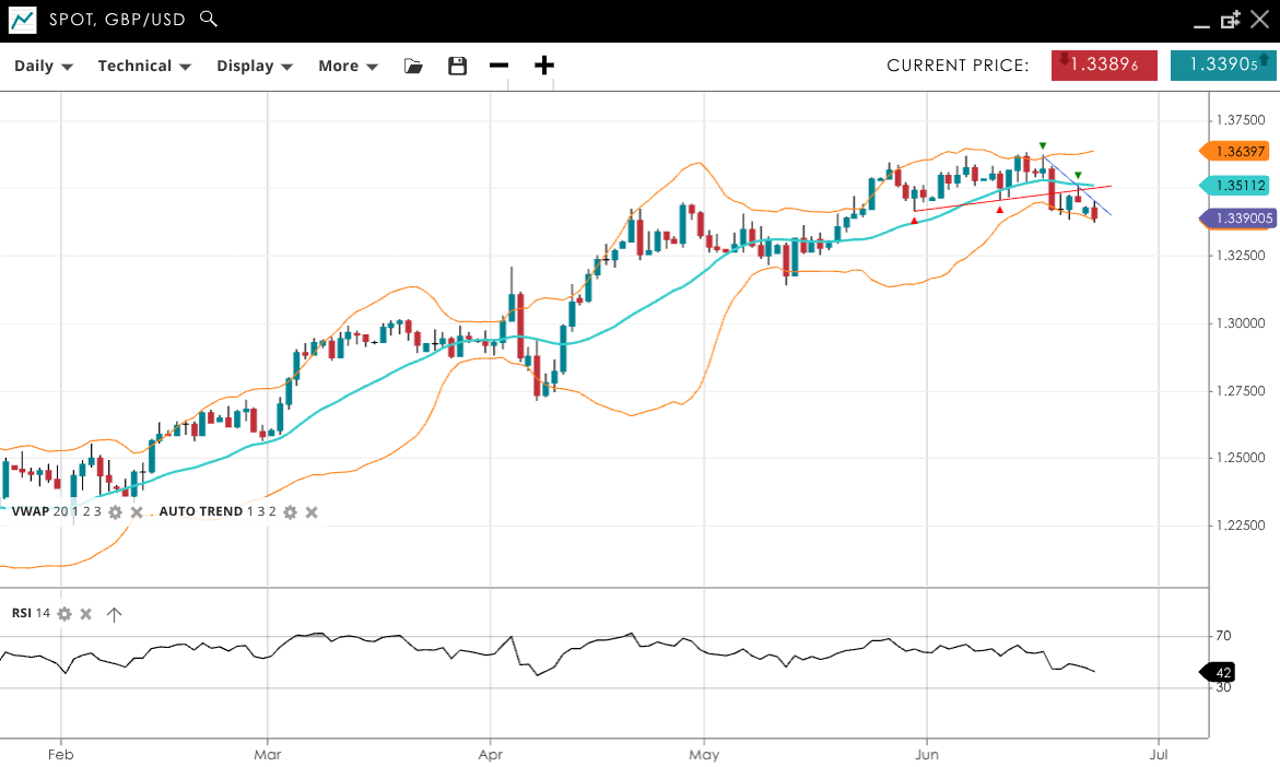 GBP/USD is still bullish but in a correction phase, currently trading at 1.3390, just below the VWAP at 1.3512. RSI at 42 points to weakening momentum. Support is at 1.3380, with resistance at 1.3639.