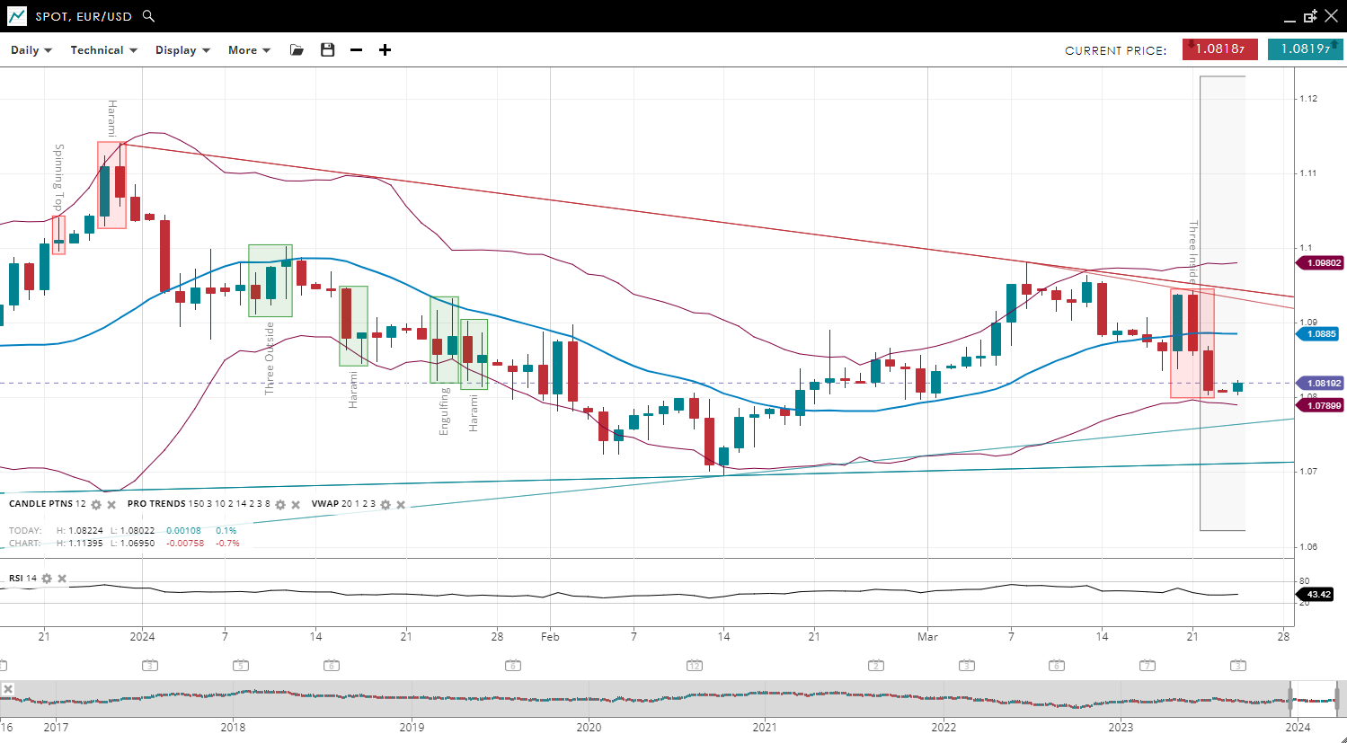 EUR/USD might be coming to the end of its bullish trend and is now in the corrective phase, with its price at 1.0819, below its upward-sloping 20-period VWAP of 1.0885. The support is now at 1.0789, with resistance at 1.0980. The RSI at 43 indicates a shift to negative momentum.