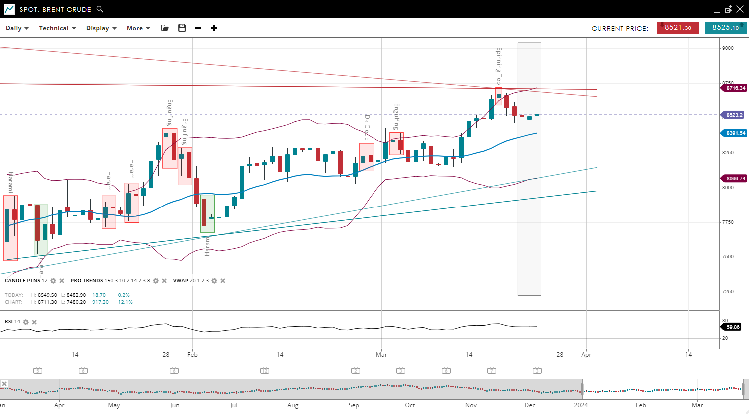 Brent Crude has slightly adjusted in its bullish trend, remaining in the impulsive phase, with its price decreasing to 85.23, above the up-sloping 20-period VWAP of 83.91. The support level is at 80.66, with resistance closely set at 87.16. The RSI has decreased to 59, indicating a slight reduction in bullish momentum.