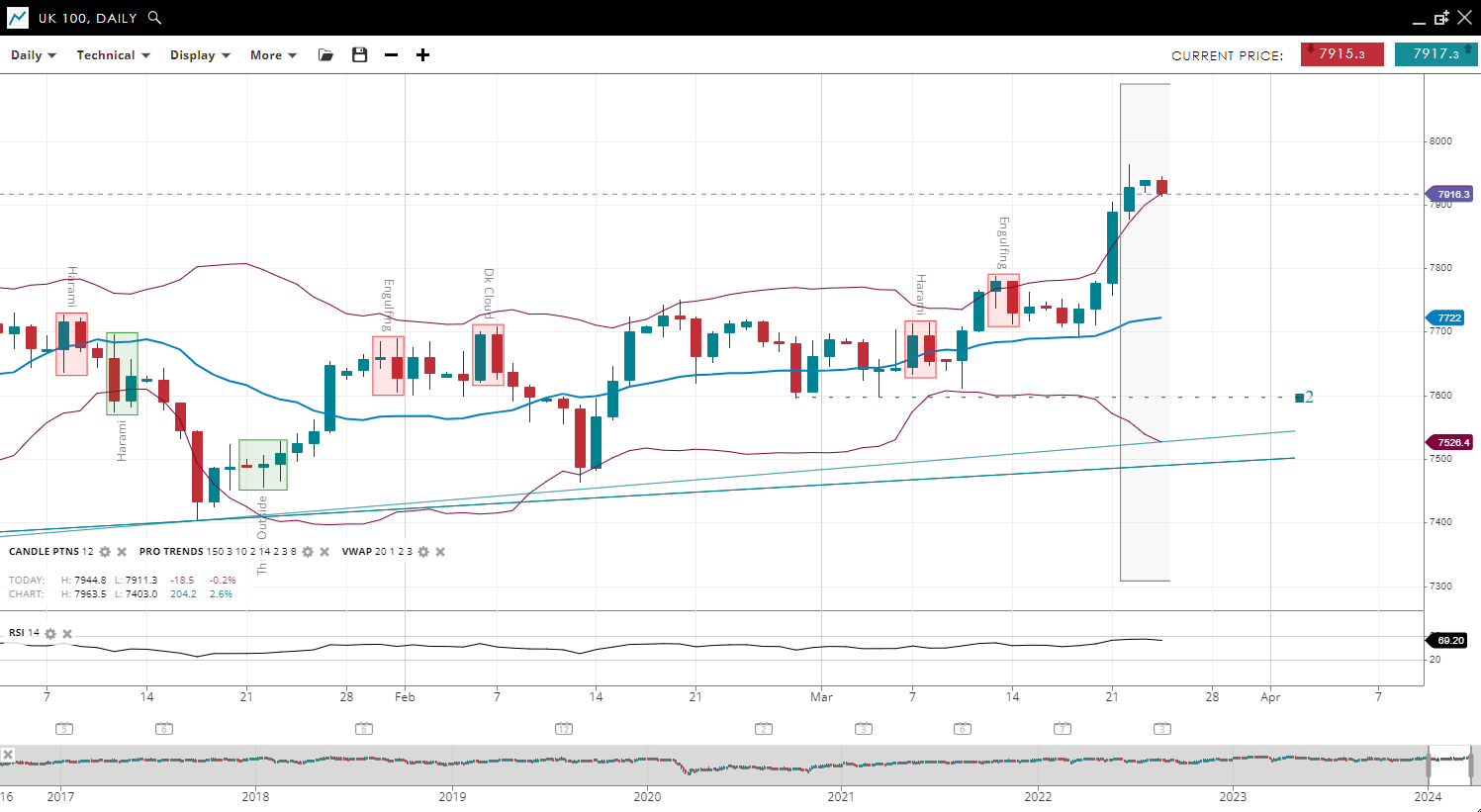 | UK 100 | Bullish | Impulsive | 7916 | 7722 | 7526 | 7917 | 69 |