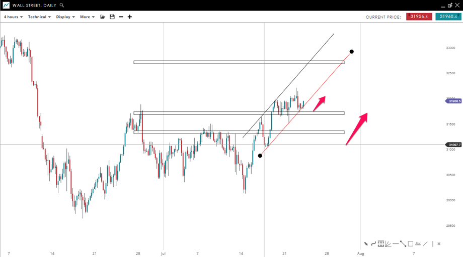 Wall Street is trading inside a bullish channel formation where the price found support near the 31,700 mark. From this level we suspect buyers may rejoin the uptrend and push the price all the way up towards the next resistance level (32,700). A drop under 31,300 would negate this bullish view.