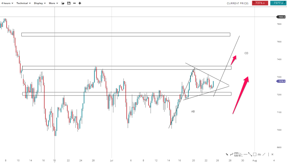 UK 100 is in a clear uptrend where higher highs and lows have been posted. The price is bouncing inside a bullish wedge pattern where there higher probability move is a breakout higher. If this scenario occurs along with a close above the pivot level (7,350), the market could continue its move to the upside toward the 7,540 mark. However, A move below the 7,200 could undo the bullish momentum.