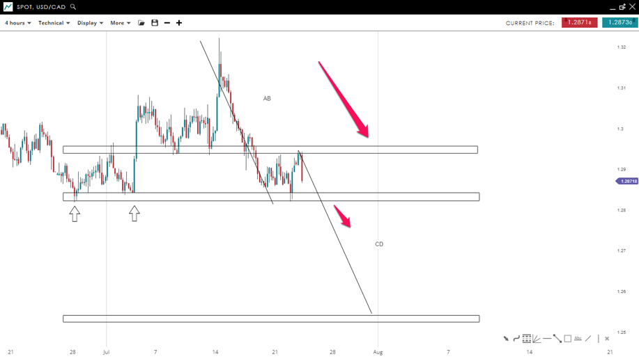 USD/CAD is trending to the downside where lower highs and lows have been posted. The price looks set to break beneath the consolidation phase. If this scenario occurs along with a break and close below the 1.28 mark, the price could reach 1.25 in the coming days. We used the AB=CD pattern to recognize how far the prices could move to the downside. However, if the market closes above the 1.29 mark, it could lead to a move higher toward 1.30.
